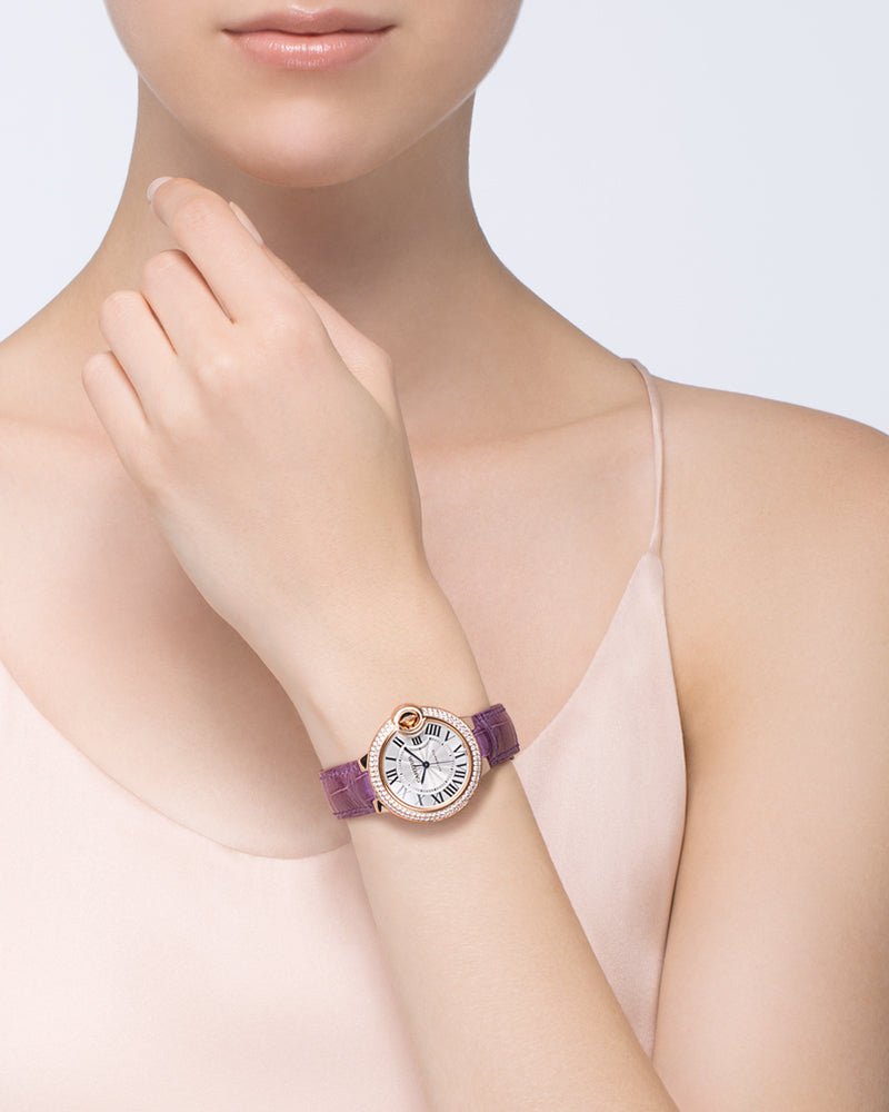 Ballon Bleu de Cartier watch. 33 mm. mechanical movement with automatic winding. 18K pink gold case set with 115 brilliant-cut diamonds totaling 0.94 carats. Fluted crown set with a sapphire cabochon. Silvered guilloche lacquered opaline dial. Blued-steel sword-shaped hands. Sapphire crystal. Purple patent leather strap. 14 mm 18K pink gold double adjustable folding buckle.