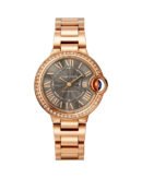 Ballon Bleu de Cartier watch. 33 mm. mechanical movement with automatic winding. 18K rose gold case set with 47 brilliant-cut diamonds totaling 0.68 carats. Fluted crown decorated with a cabochon sapphire. Gray guilloché dial. Blued-steel sword-shaped hands. Sapphire crystal. 18K rose gold bracelet. Case thickness: 10 mm. Water-resistant to 3 bar (approx. 30 meters).