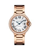 Ballon Bleu de Cartier watch. 36 mm. self-winding mechanical movement. 18K pink gold case set with 123 brilliant-cut diamonds totaling 1.21 carats. fluted crown set with a sapphire cabochon. silvered guilloche lacquered opaline dial. blued-steel sword-shaped hands. sapphire crystal. 18K pink gold bracelet. Wrist size: 180 mm.