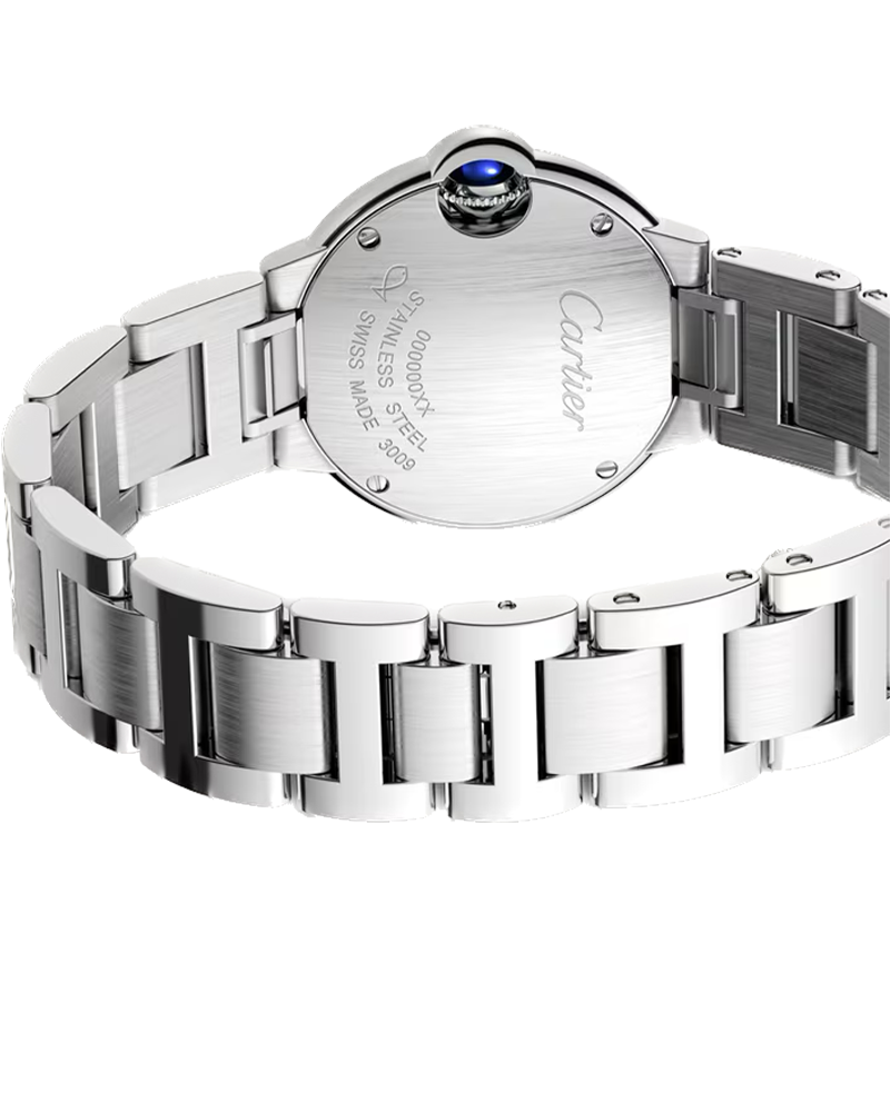 Ballon Bleu de Cartier watch. 28 mm. quartz movement. Steel case. fluted steel crown set with a synthetic cabochon-shaped spinel. Steel bezel set with 42 diamonds totaling 0.48 carats. Opaline dial. Blued-steel sword-shaped hands. Sapphire crystal. Interchangeable steel bracelet. wrist size 6.5. Thickness: 0.35. Water-resistant to 3 bar (approx. 30 meters/100 feet).