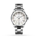 Framed by a scratch-proof. ceramic inlayed bezel. the white dial features hands and indexes coated in luminescent Super-LumiNova for superior readability.
