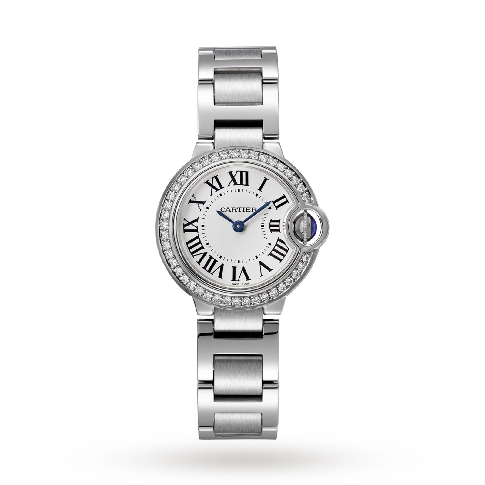 Ballon Bleu de Cartier watch. 28 mm. Quartz movement. Steel case and steel fluted crown set with a synthetic cabochon-shaped spinel. Steel bezel set with 42 diamonds totaling 0.52 carats. Opaline dial. Blued-steel sword-shaped hands. Sapphire crystal. Steel bracelet. wrist size: 165 mm. Thickness: 9 mm. Water-resistant to 3 bar (approx. 30 meters/100 feet).