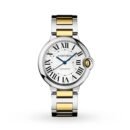 Ballon Bleu de Cartier watch. 36 mm. mechanical movement with automatic winding. Steel case. yellow gold 750/1000 fluted crown set with a cabochon synthetic spinel. Silver guilloché dial. Blued-steel sword-shaped hands. Sapphire crystal. Two-tone interchangeable bracelet. Case thickness: 12.1 mm. Water-resistant up to 3 bar (approx. 30 meters/100 feet).
