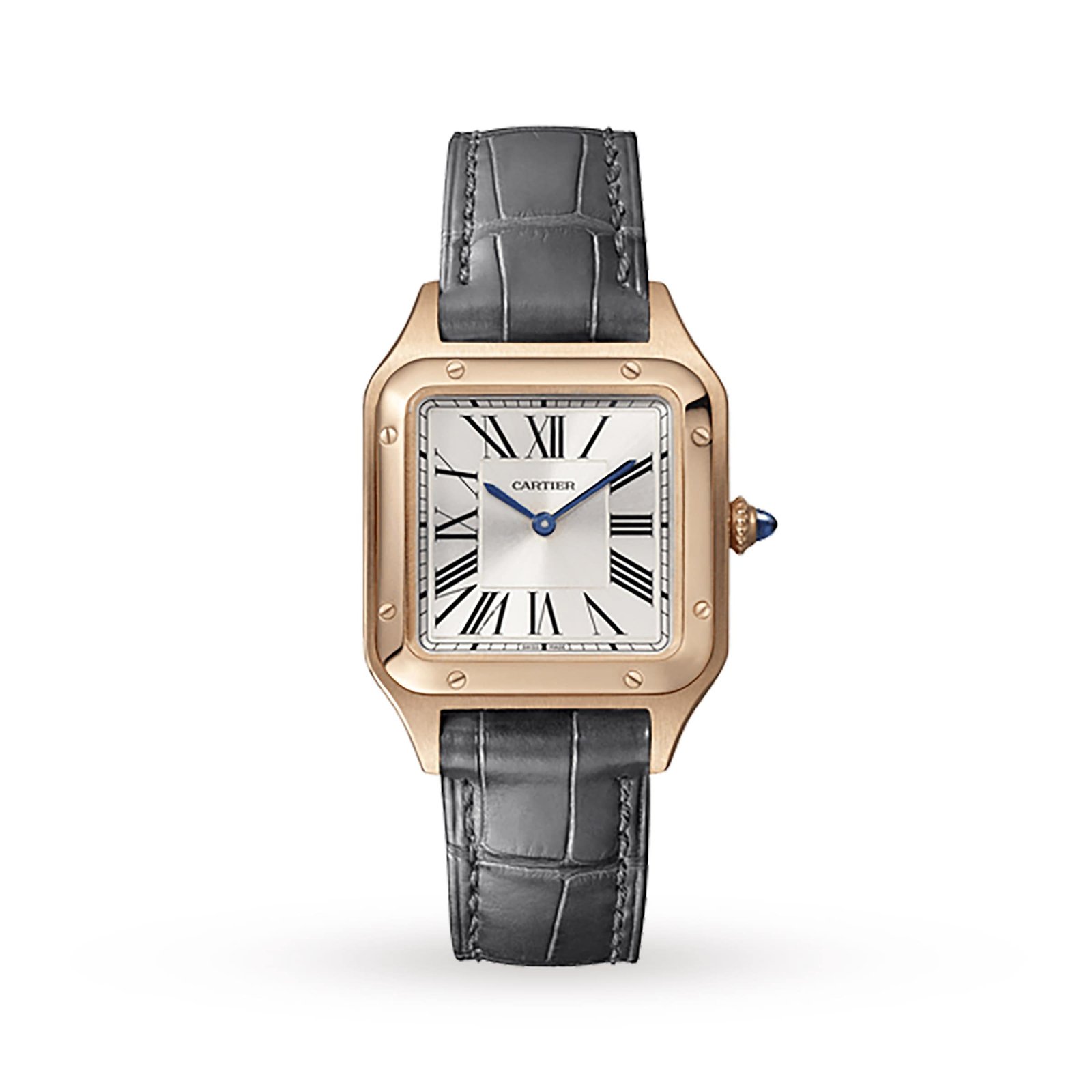 Santos-Dumont watch. small model. high autonomy quartz movement (~ 6 years). 18K rose gold case. beaded crown set with a cabochon-shaped sapphire. silvered satin-brushed dial with sunray effect. Roman numerals. blued-steel sword-shaped hands. sapphire crystal. grey alligator-skin strap. 18K rose gold ardillon buckle. Case dimensions: 38 mm x 27.5 mm. thickness: 7.3 mm. Water-resistant to 3 bar (approx. 30 metres).