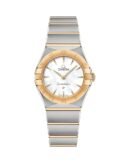 This 25 mm 18K yellow gold and stainless steel model features a bezel engraved with Roman numerals. white mother-of-pearl dial and scratch-resistant saphire crystal. The hands. OMEGA logo. Constellation star and indexes are also in 18K yellow gold.