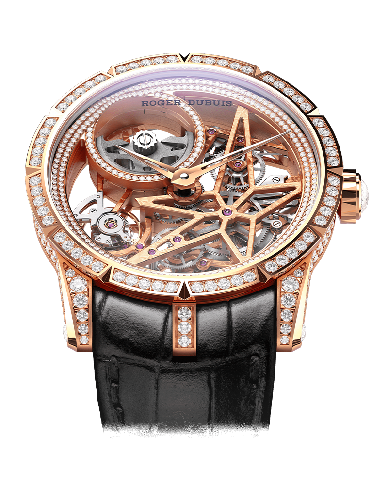 The skeleton calibres manufactured by Roger Dubuis in Geneva are the essence of the expressive singularity of the Excalibur collection. Complying with one of the most respected certifications of Haute Horlogerie. the Poinçon de Genève. the Excalibur watches are designed like contemporary works of art. Every single component being finished by hand. the watches are symbols of passion. The work of hyper-skilled craftsmen is at the forefront of each watch with a direct view on the creative mechanics making these pieces more alive than ever. CASE – Pink gold case paved with with round diamonds on the bezel. lugs and sides Sapphire crystal with anti-reflective coating Pink gold open case back with sapphire crystal. Size: 42mm Water Resistance: 3 bar (30 m).DIAL-Flange set with two rows of round diamonds. Micro-rotor bridge set with round diamonds Main material: Pink Gold 18K.STRAP – Black strap. CLASP- Pink gold adjustable folding buckle set with brilliant-cut diamonds. Type: Pink Gold 18K.MOVEMENT- Energy: Automatic. self-winding. Indications: Hour – Minute. Power reserve: 60 Hours