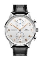 Stainless steel case with a black (alligator) leather strap. Fixed stainless steel bezel. Silver-tone dial with gold-tone leaf-style hands and Arabic numeral hour markers. Arabic numeral minute markers (at 5 minute intervals). Minute markers around the outer rim. Dial Type: Analog. Chronograph – two sub-dials displaying: 60 second and 30 minute. IWC calibre 69355 automatic movement. based upon IWC 69370. containing 27 Jewels. composed of 194 parts. bitting at 28800 vph. and has a power reserve of approximately 46 hours. Scratch resistant sapphire crystal. Pull / push crown. Transparent case back. Round case shape. Case size: 40.9 mm. Case thickness: 12.5 mm. Band width: 20 mm. Deployment clasp. Water resistant at 30 meters / 100 feet. Functions: chronograph. column wheel. hour. minute. small second. Luxury watch style. Watch label: Swiss Made. IWC Chronograph Automatic Silver Dial Watch IW3716-04