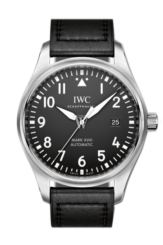 Stainless steel case with a black santoni calfskin leather strap (red backed). Fixed stainless steel bezel. Black dial with black hands and Arabic numeral hour markers. Minute markers around the outer rim. Dial Type: Analog. Luminescent hands and markers. Date display at the 3 o’clock position. IWC calibre 30110 automatic movement with a 42-hour power reserve. Scratch resistant sapphire crystal. Screw down crown. Solid case back. Case size: 40 mm. Case thickness: 11 mm. Round case shape. Tang clasp. Water resistant at 60 meters / 200 feet. Functions: date. hour. minute. second. Luxury watch style. Watch label: Swiss Made. IWC Pilots Mark XVIII Automatic Black Dial Mens Watch IW327001