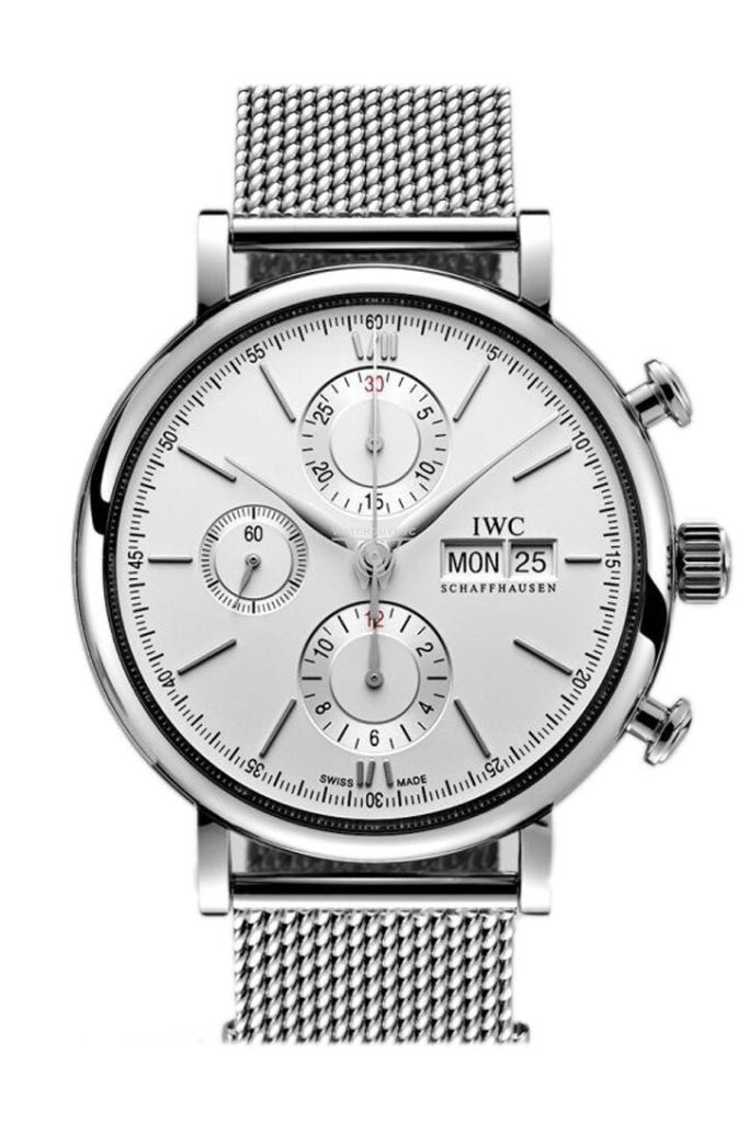 Stainless steel case with a stainless steel mesh bracelet. Fixed stainless steel bezel. Silver-plated dial with silver-toned hands and index hour markers. Minute markers around the outer rim. Dial Type: Analog. Day of the week and date display at the 3 o’clock position. Chronograph – three sub-dials displaying: 60 second. 30 minute and 12 hour. Mechanical movement with a 44-hour power reserve. Scratch resistant sapphire crystal. Pull / push crown. Solid case back. Case diameter: 42 mm. Case thickness: 13.5 mm. Round case shape. Deployment clasp. Water resistant at 30 meters / 100 feet. Functions: chronograph. date. hour. minute. second. Luxury watch style. Watch label: Swiss Made. IWC Portofino Silver Plated Dial Stainless Steel Chronograph Mens Watch IW391009