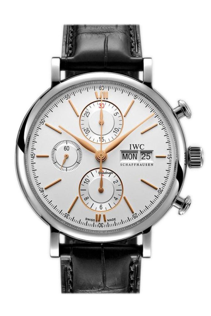 Stainless steel case with a black (alligator) leather strap. Fixed stainless steel bezel. Silver dial with rose gold-tone hands and index hour markers. Roman numerals amrk the 6 and 12 o’clock positions. Minute markers around the outer rim. Dial Type: Analog. Day of the week and date display at the 3 o’clock position. Chronograph – three sub-dials displaying: 60 second. 30 minute and 12 hours. IWC calibre 75320 automatic movement with a 44-hour power reserve. Scratch resistant sapphire crystal. Pull / push crown. Transparent case back. Round case shape. Case size: 42 mm. Case thickness: 13.6 mm. Band width: 20 mm. Tang clasp. Water resistant at 30 meters / 100 feet. Functions: chronograph. date. day of the week. hour. minute. second. Luxury watch style. Watch label: Swiss Made. IWC Portofino Chronograph Automatic Silver Dial Mens Watch