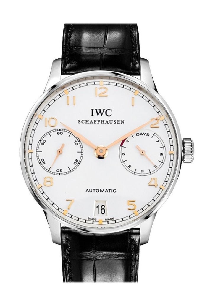 IWC Portugieser Automatic IW5001 men’s watch. features a 42.3mm case surrounding either a black. silver-plated dial on an alligator leather strap. Case options include stainless steel. 18K white gold. The movement is the IWC manufactured 51011 caliber and the functions include hours. minutes. seconds. date and power reserve. This watch features a 7 day power reserve and is water resistant to 30m. Reference numbers available: IW5007-05.