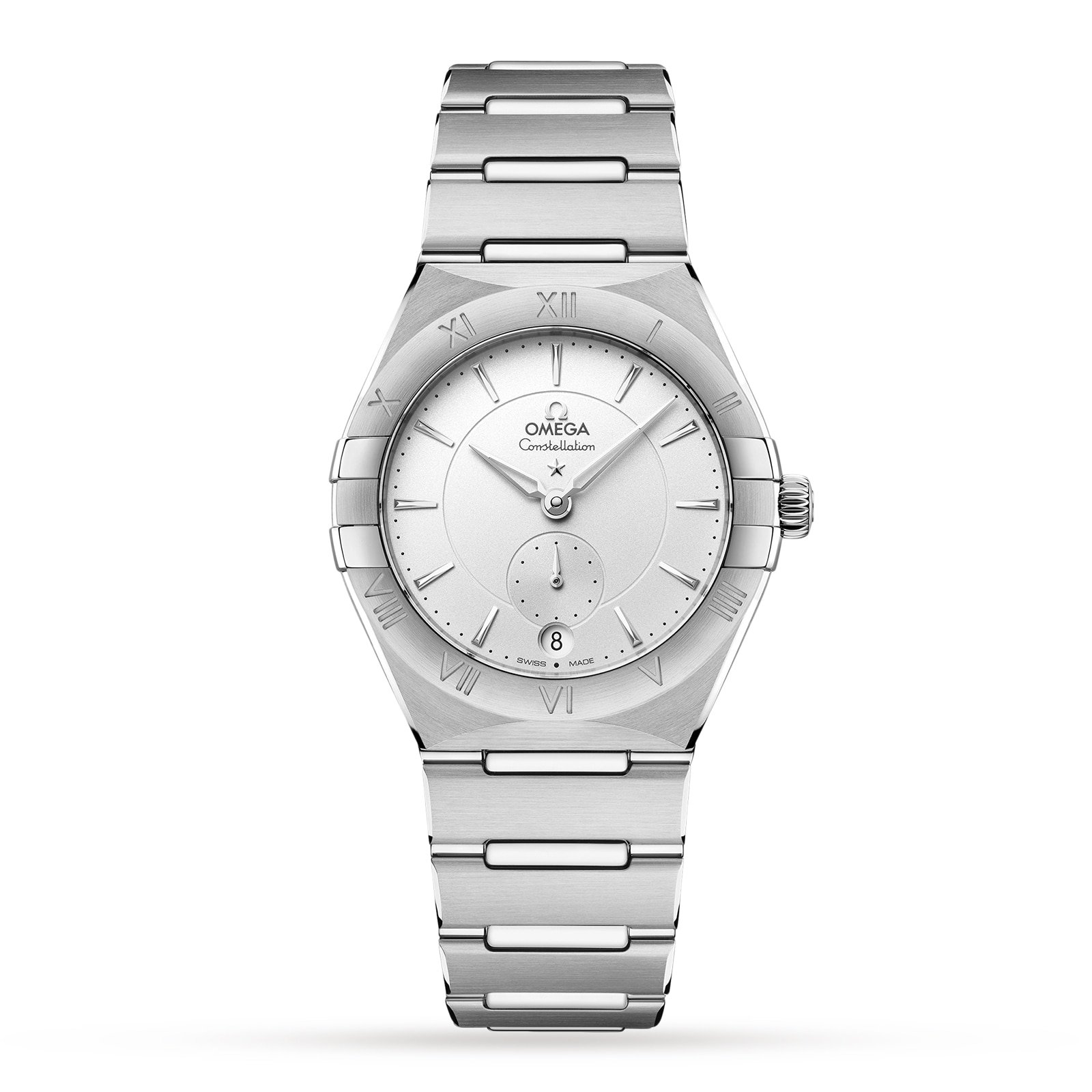 This 34 mm model in stainless steel features a bezel with engraved Roman Numerals. a crystal white silvery dial. and a round date window at the 6 o’clock position. The polished hour markers. hands. OMEGA logo and Constellation star are all in 18K white gold. while the Small Seconds subdial and Central Minute Track are circled by rings.