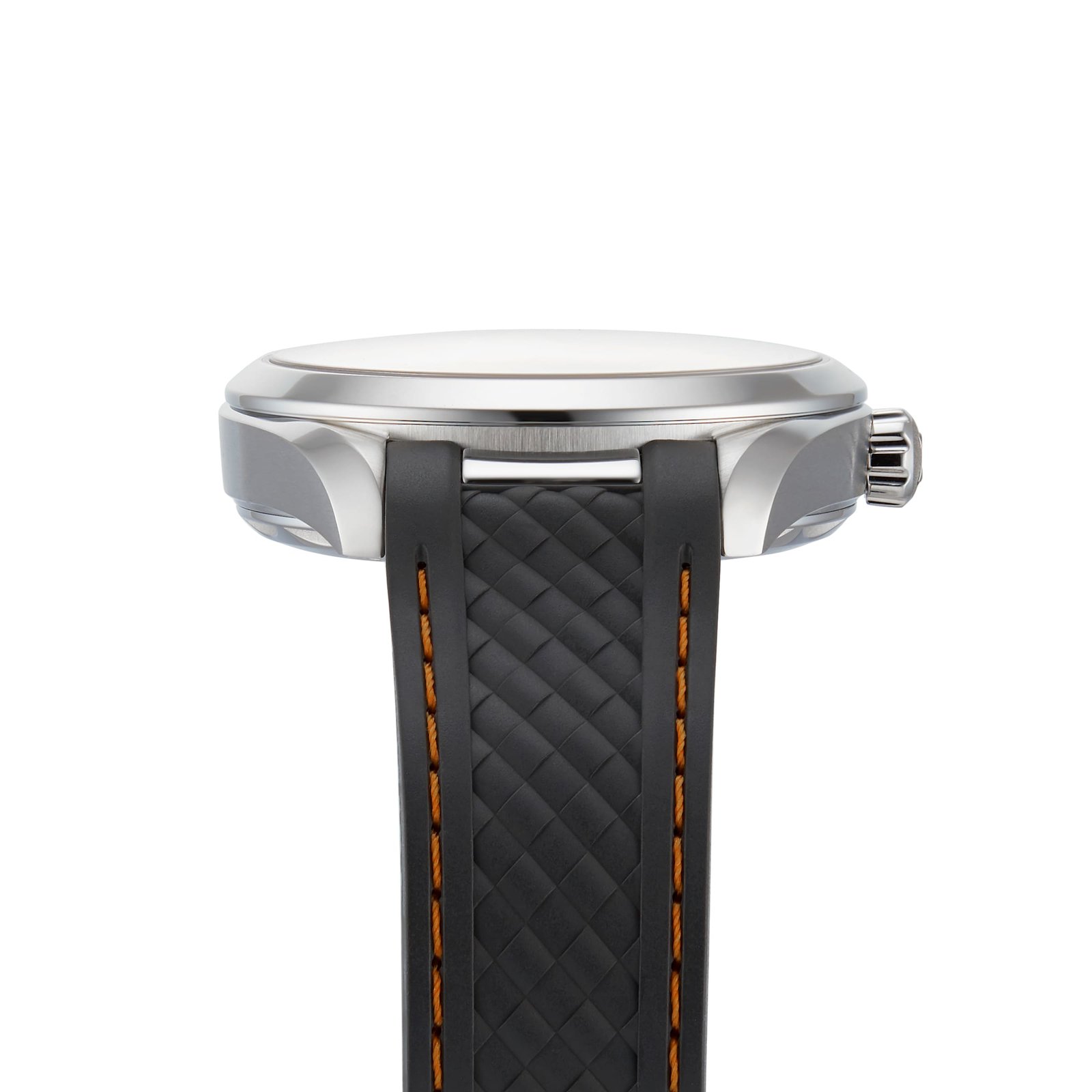 Made with structured rubber. lined with grey with orange stitching. the integrated strap provides a distinctly nautical feel. while the self-locking crown used by divers. provides impeccable water resistance.