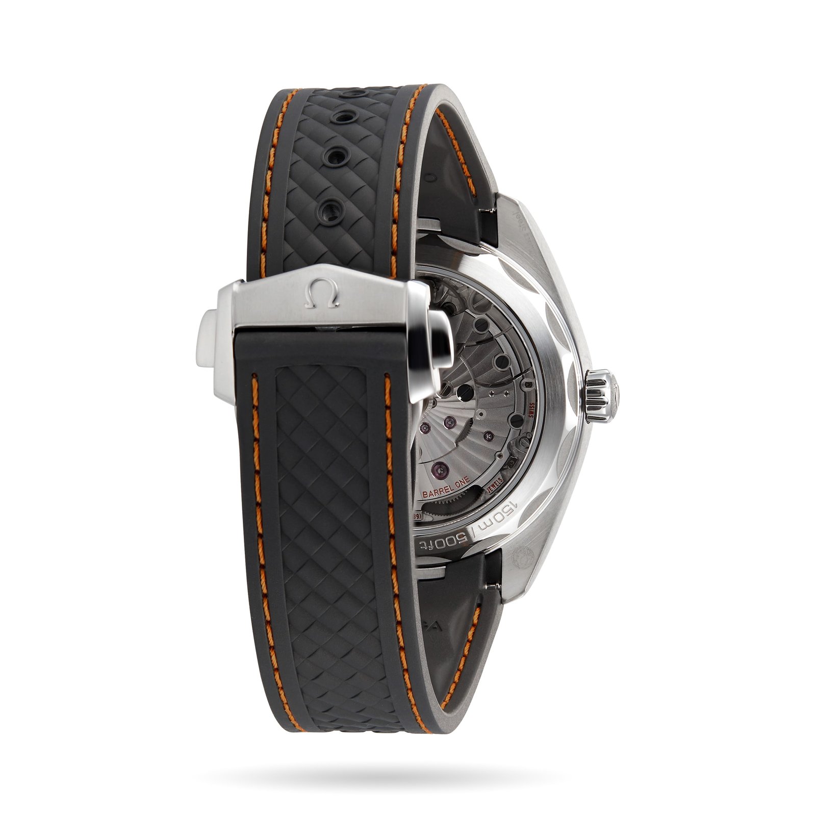 The blackened hands and indexes are filled with white Super-LumiNova. with a striking orange central seconds hand and iconic Seamaster wording. Orange is also used to highlight the four quarter numbers on the minute track.