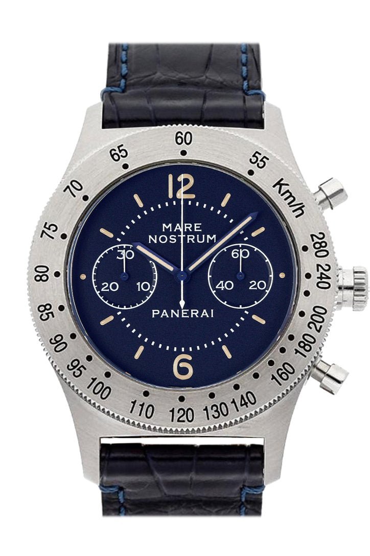 Stainless steel case with a blue (alligator) leather strap. Fixed stainless steel bezel showing tachymeter markings. Blue dial with luminous blue hands and index hour markers. Arabic numerals mark the 6 and 12 o’clock positions. minute markers around an inner ring. Dial Type: Analog. Luminescent hands and markers. Chronograph – two sub-dials displaying: 60 second and 30 minute. Panerai calibre OP XXXIII hand wind movement with a 42-hour power reserve. Scratch resistant sapphire crystal. Pull / push crown. Solid case back. Round case shape. Case size: 42 mm. Band width: 22 mm / 22 mm. Tang clasp. Water resistant at 50 meters / 165 feet. Functions: chronograph. tachymeter. hour. minute. second. Additional Info: limited edition of 1000 pieces. Luxury watch style. Watch label: Swiss Made. Panerai Mare Nostrum Acciaio Chronograph Blue Dial Mens Watch PAM00716