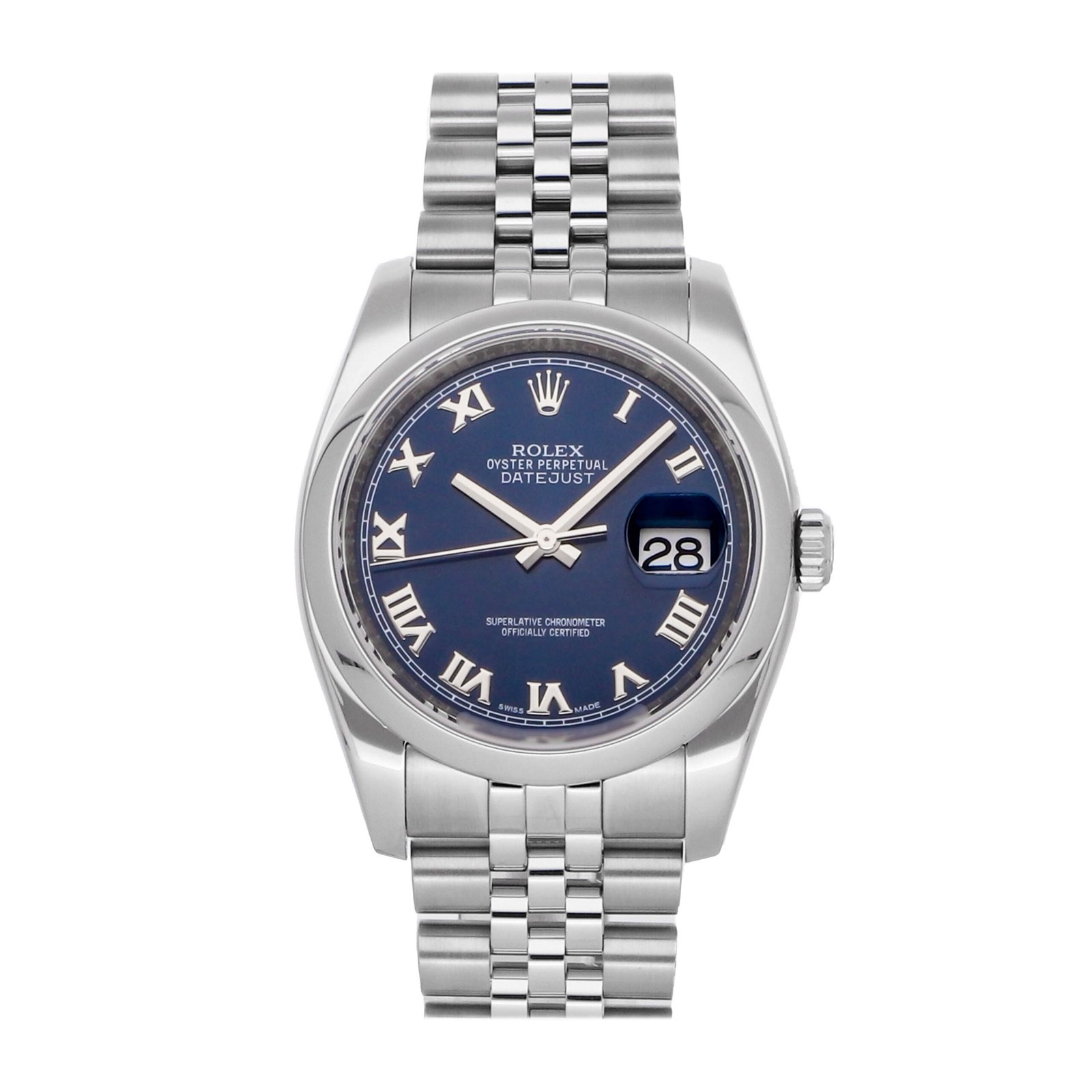 Pre-Owned Rolex Datejust (116200) self – winding automatic watch. features a 36mm stainless steel case surrounding a blue dial on a stainless steel Jubilee bracelet with folding buckle. Functions include hours. minutes. seconds and date.This watch does not come with box or papers. Z Serial.We back this watch with a 2-Year WatchBox warranty!