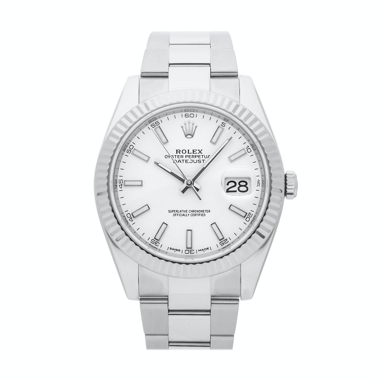 Coming soon! This item will be available to ship in 3-6 weeks. Photo is representative-only.Pre-Owned Rolex Datejust 41 (126334) self-winding automatic watch. features a 41mm stainless steel case with an 18k white gold fluted bezel surrounding a white dial on a stainless steel Oyster bracelet with folding buckle. Functions include hours. minutes. seconds and date.This watch comes complete with the original box and papers. Scattered Serial.Time remaining on the factory warranty!