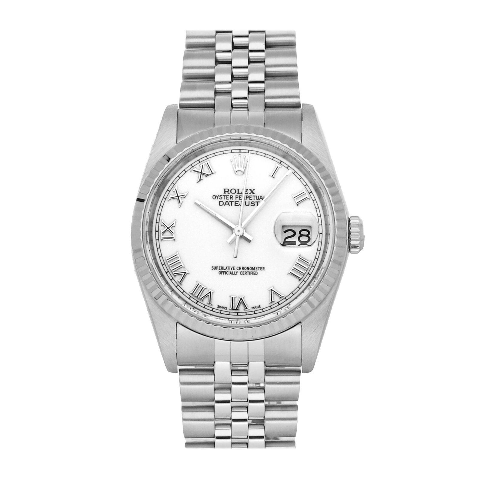 Pre-Owned Rolex Datejust (16234) self – winding automatic watch. features a 36mm stainless steel case with an 18k white gold fluted bezel surrounding a white dial on a stainless steel Jubilee bracelet with folding buckle. Functions include hours. minutes. seconds and date.This watch does not come with box or papers. L Serial.We back this watch with a 2-Year WatchBox warranty!