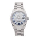 Pre-Owned Rolex Day-Date (118206) self-winding automatic watch. features a 36mm platinum case surrounding an ice blue wave dial on a platinum Presidential bracelet with folding buckle. Functions include hours. minutes. seconds. day and date.This watch has been serviced and comes with box. P Serial.Time remaining on the Manufacturer’s service warranty!