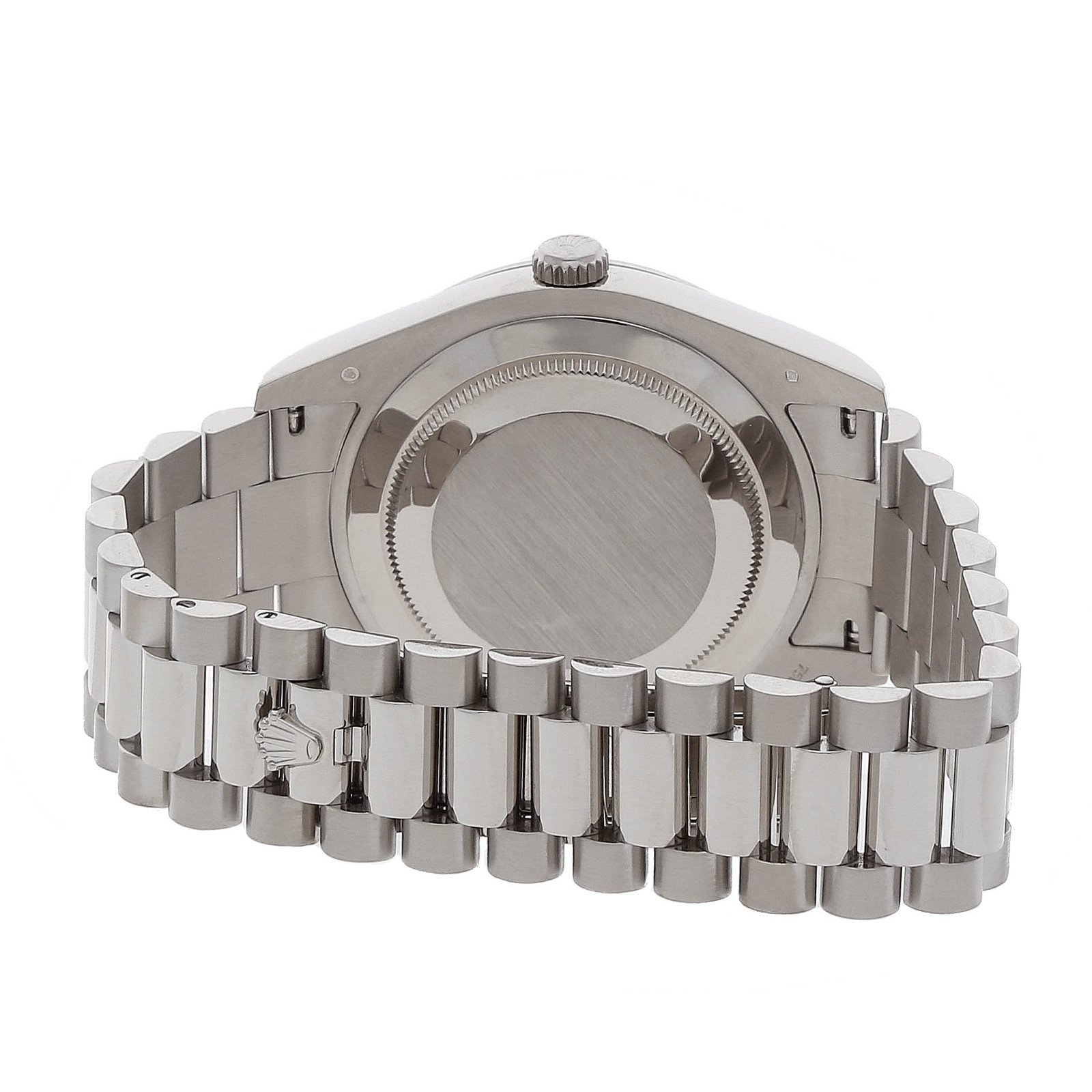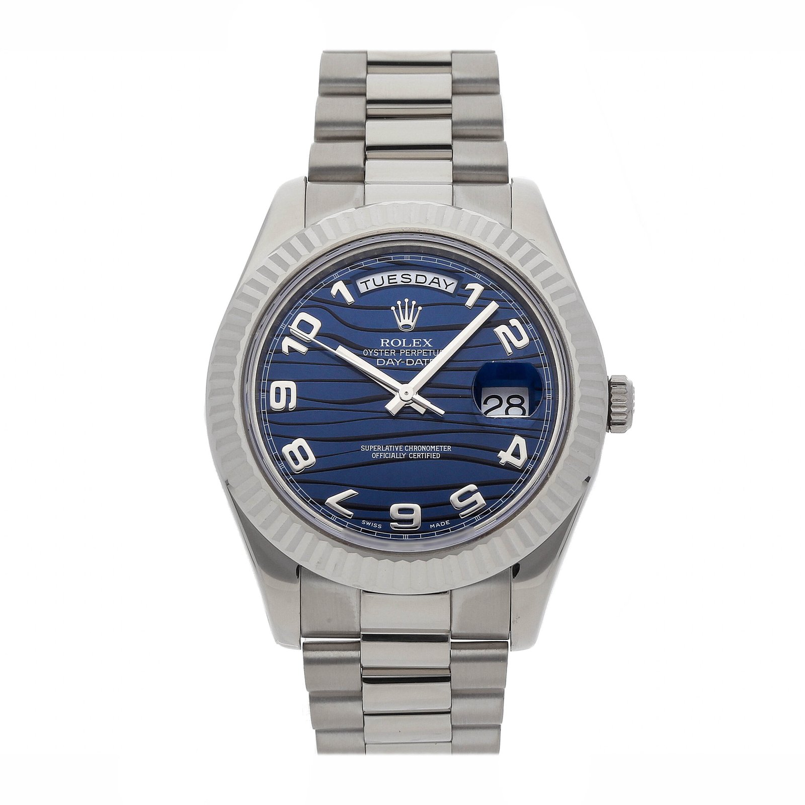 Pre-Owned Rolex Day-Date (218239) self – winding automatic watch. features a 41mm 18k white gold case surrounding a blue wave dial on an 18k white gold President bracelet with folding buckle. Functions include hours. minutes. seconds. day and date.This watch has been serviced and comes without box or papers. V Serial.Time remaining on the Manufacturer’s service warranty!This watch will be ready to ship in 5-7 days!