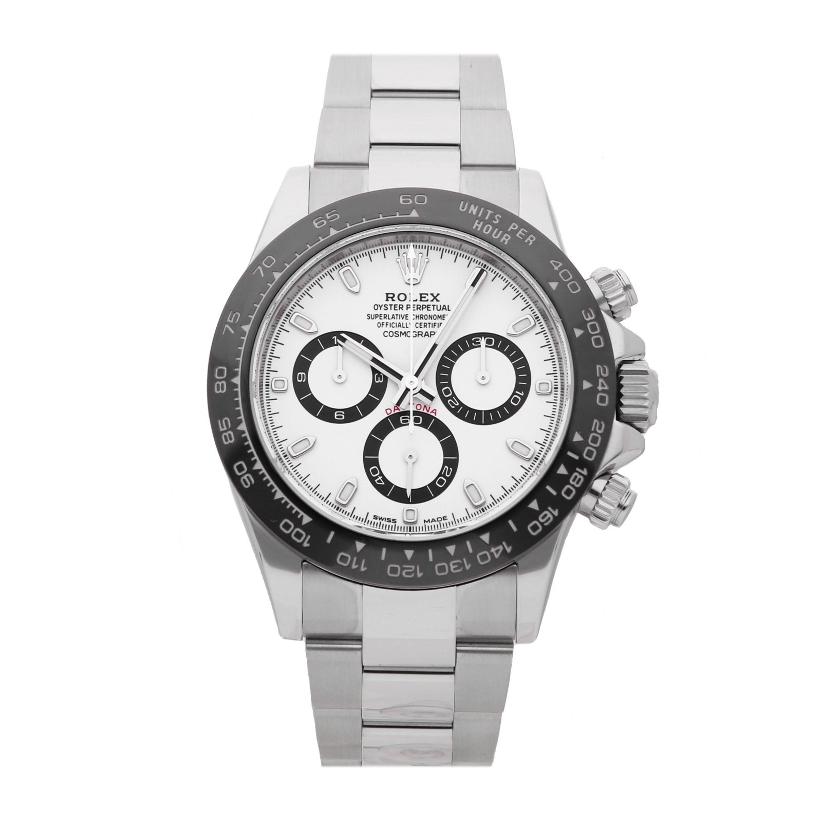 Coming soon! This item will be available to ship in 3-6 weeks. Photo is representative-only.Pre-Owned Rolex Daytona Cosmograph (116500LN) self-winding automatic watch. features a 40mm stainless steel case with a black Cerachrom bezel surrounding a white dial on a stainless steel Oyster bracelet with folding buckle. Functions include hours. minutes. small seconds. chronograph and tachymeter.This watch comes complete with box and papers. Scattered Serial.Time remaining on the factory warranty!
